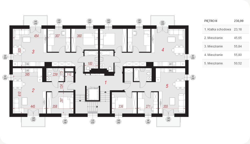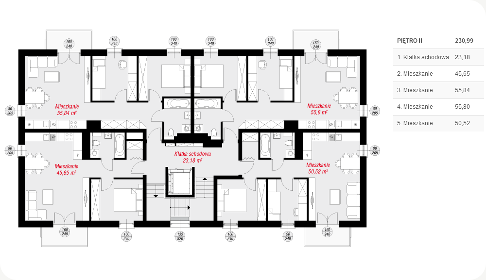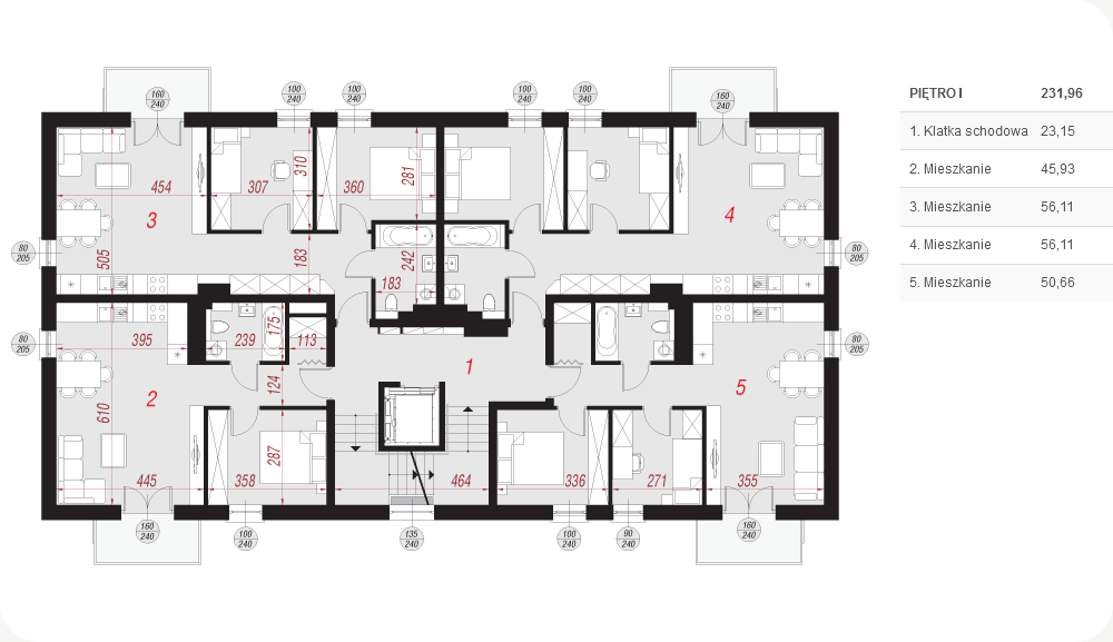 Na każdym piętrze mamy 4 mieszkania. Mieszkanie A: 46 m2 Mieszkanie B: 57 m2 Mieszkanie C: 57 m2 Mieszkanie D: 51 m2 Każde mieszkanie posiada balkon lub taras.